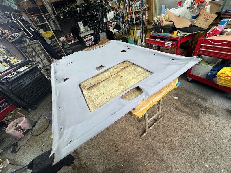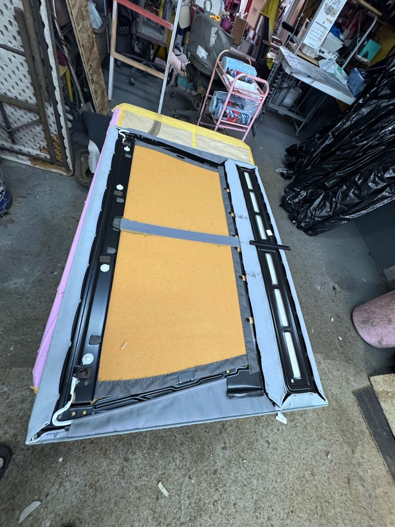 サンルーフボードは脱着後、天井と同様に下地処理を行い、新しい黒生地へ張り替え。
